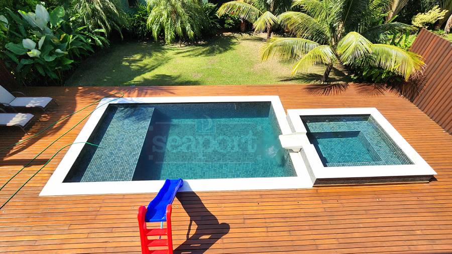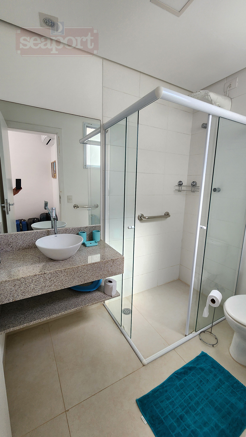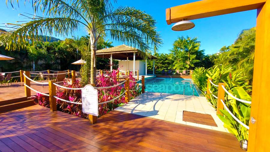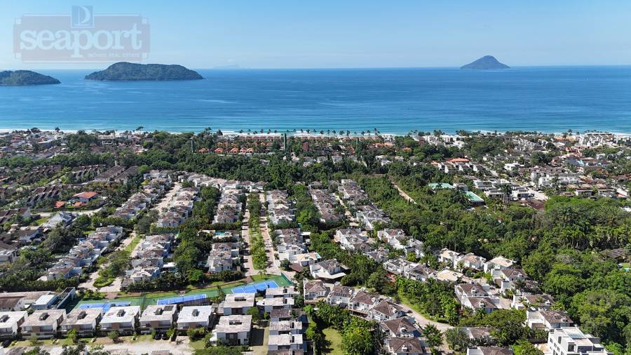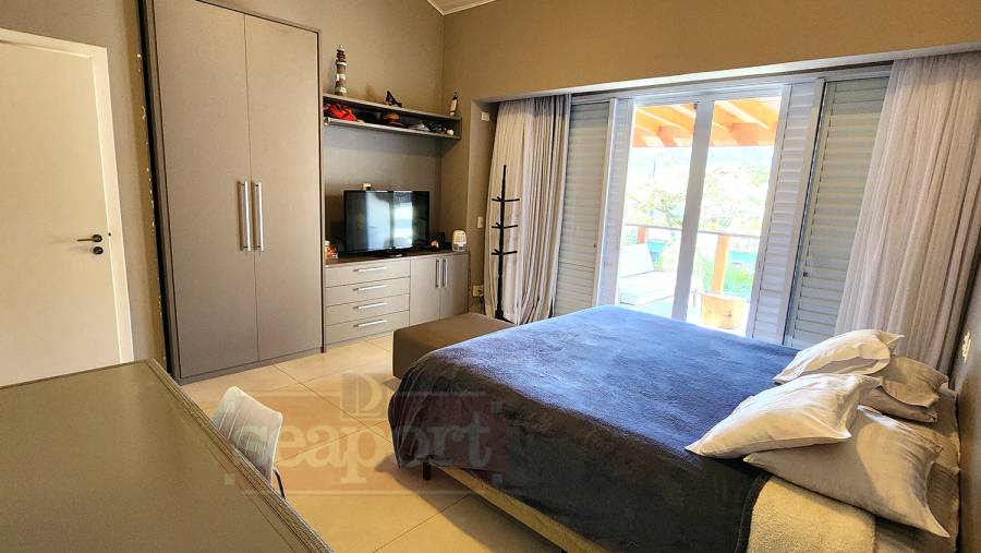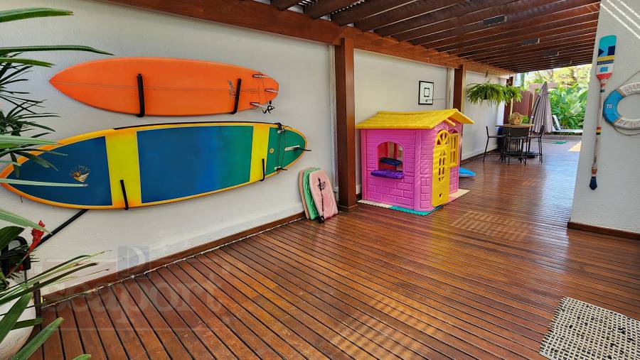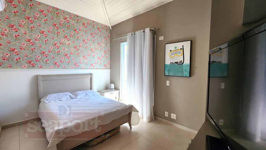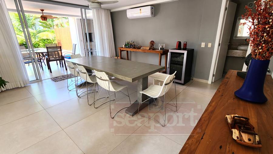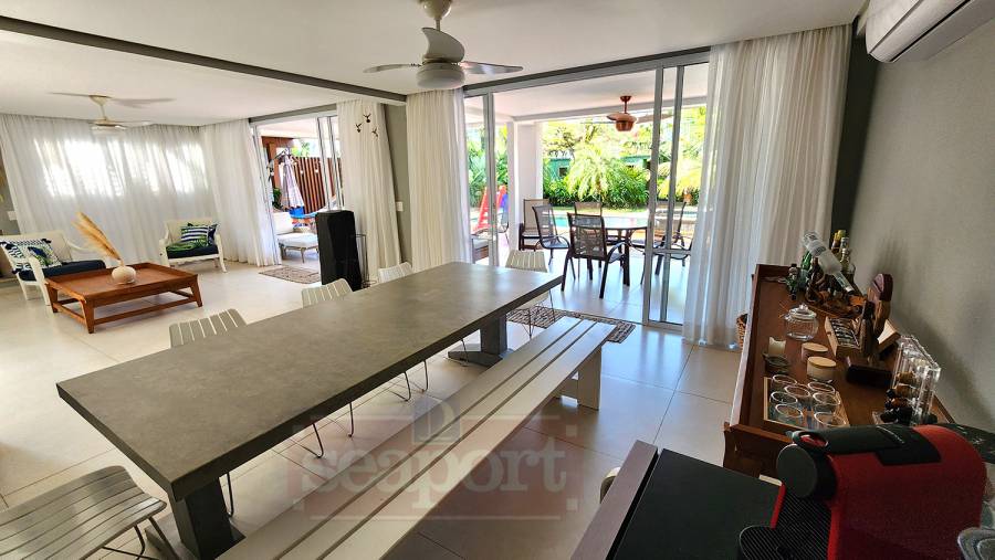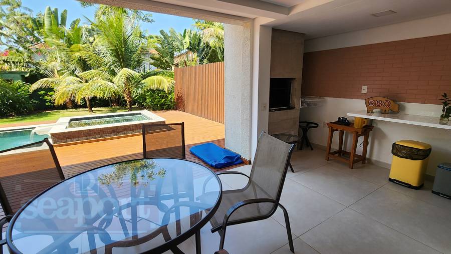 Residência charmosa em condomínio fechado à 150m da praia, com 288m² de área construída, em fração ideal de terreno de 1.128m². Possui 4 suítes, amplas salas de estar, jantar e tv, cozinha, varanda com deck, piscina privativa, espaço gourmet