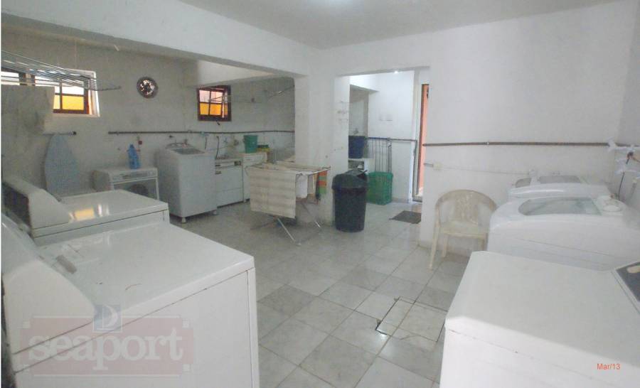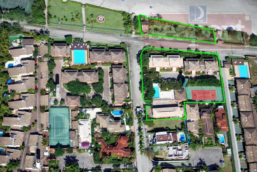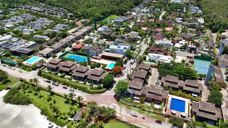 O condomínio possui piscina, quadra de tênis, sauna, salão de jogos, garagem coberta com uma suíte de serviço/empregada, churrasqueira para uso comum, jardim no terreno de marinha e serviço de praia com cadeiras e guarda-sol.