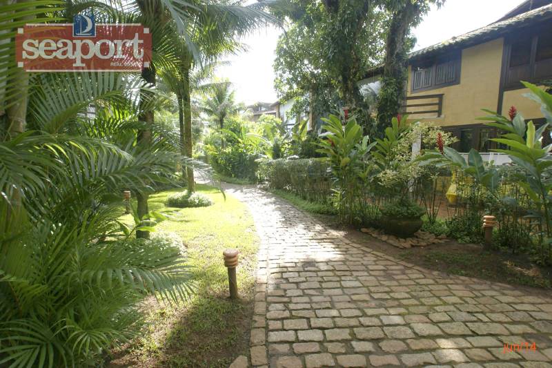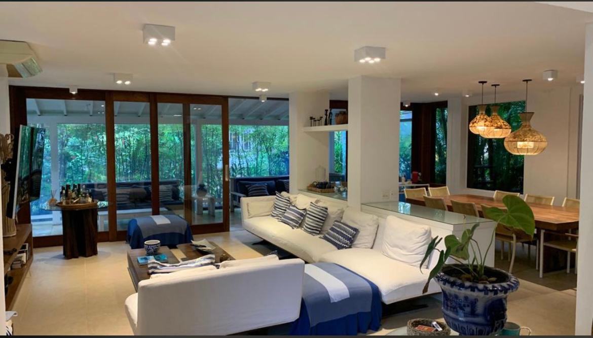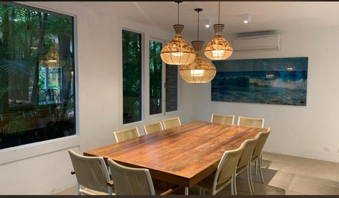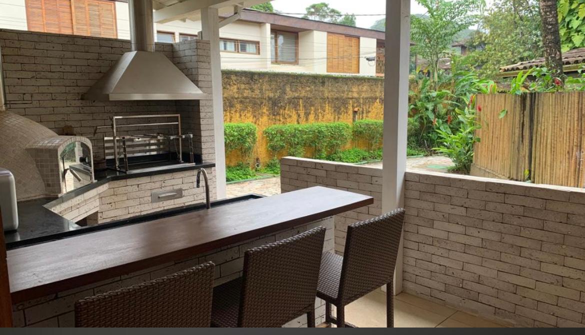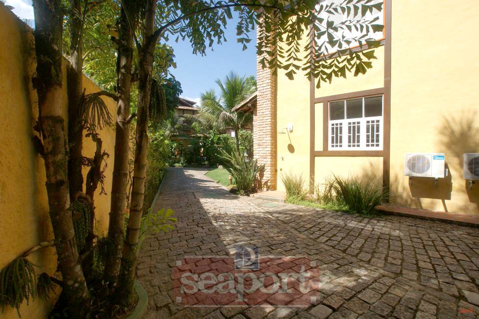 Residência em condomínio fechado à 50m da praia, com ~290m² área construída. Possui 4 suítes com sacada, sala de jantar, tv, lavabo, cozinha, lavanderia, dependência de empregado, terraço, churrasqueira, forno para pizza.