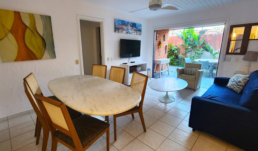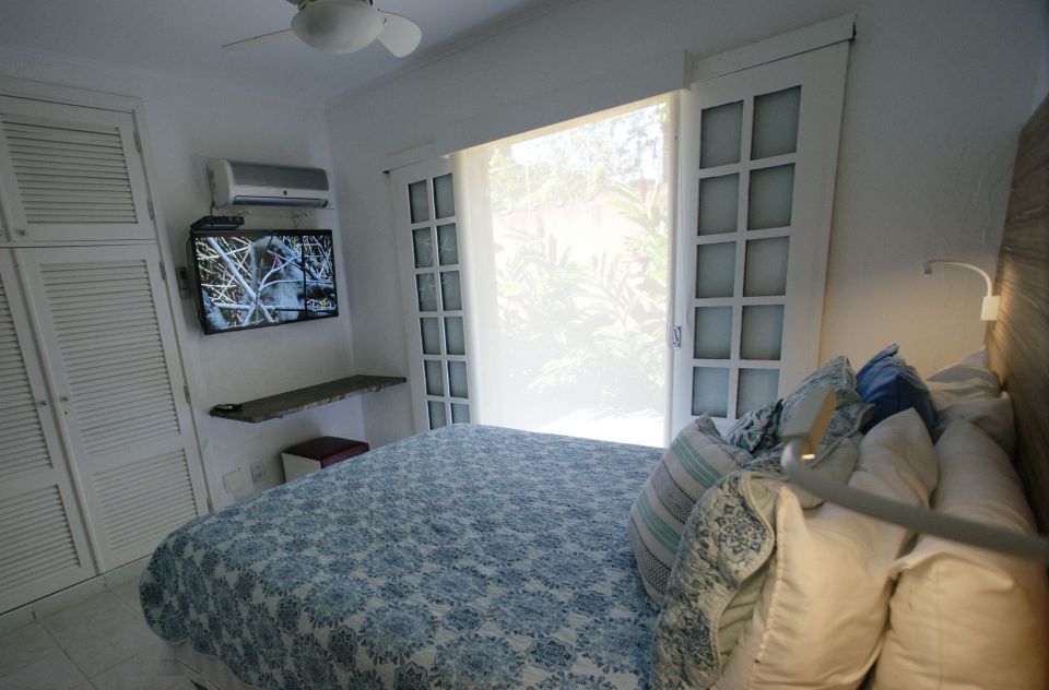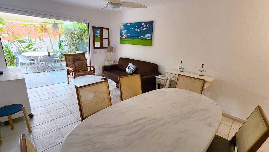 Residência térrea em condomínio fechado de frente para o mar com 80m² de área construída, com 3 suítes, sala de estar e jantar, cozinha americana, varanda com churrasqueira, quintal e vaga para 2 autos. Há WiFi na casa e em todo condomínio com velocidade até 100Mb. O condomínio possui área frente ao mar pé na areia com banheiros, chuveirão, quiosque, playground, ombrelones, cadeiras e espreguiçadeiras. Piscina com banheiros, quadra de tênis nova Play Piso iluminada, sauna, fitness, sala de jogos, brinquedoteca, playground interno, bicicletario, espaço gourmet e solário com vista para o mar, 16 câmeras de segurança, serviço de praia com 4 cadeiras, mesinha e 2 guarda sol, alojamento de funcionários e zeladoria
