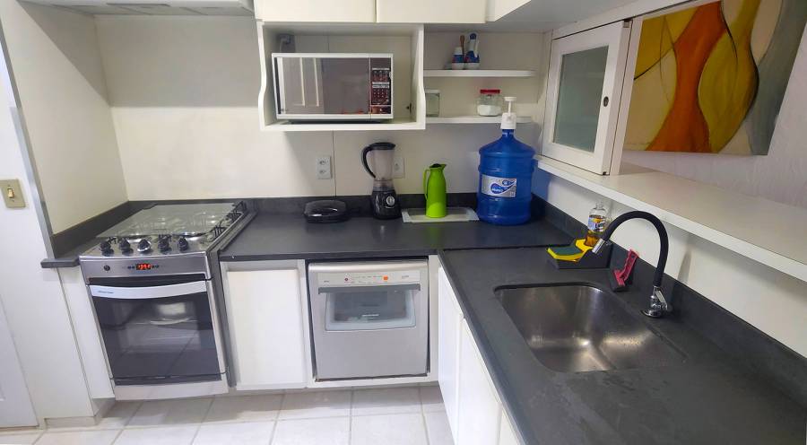 Cozinha c/ Lava pratos, micro ondas, refil galão 20L, liquidificador, minigrill, exautor e forno/fogão