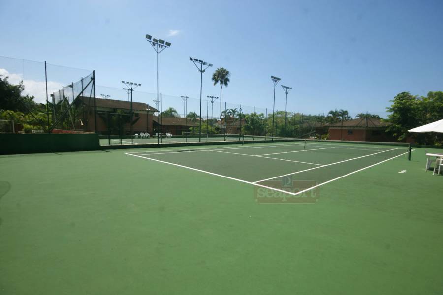 "O condomínio possui quadra de tênis, quiosque/deck/jardim frente ao mar, chuveirão, churrasqueira, piscina aquecida, serviço de praia, sauna seca, salão de festa e jogos com bilhar, pebolim, tênis de mesa, captação de água, poço semi artesiano e portaria