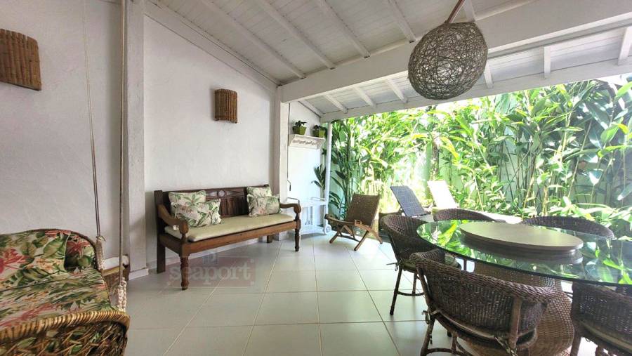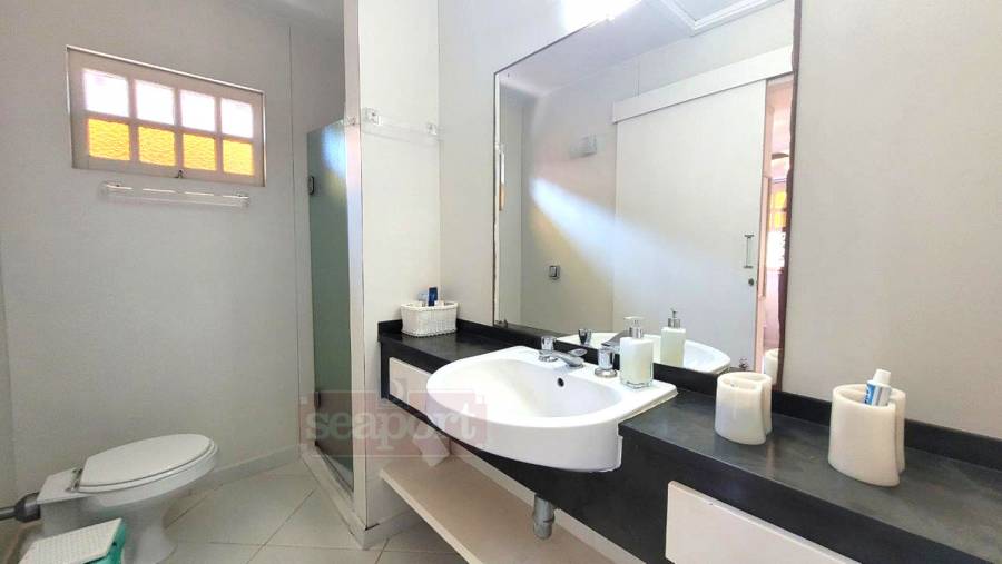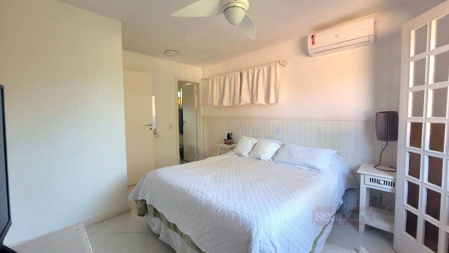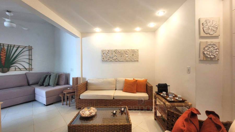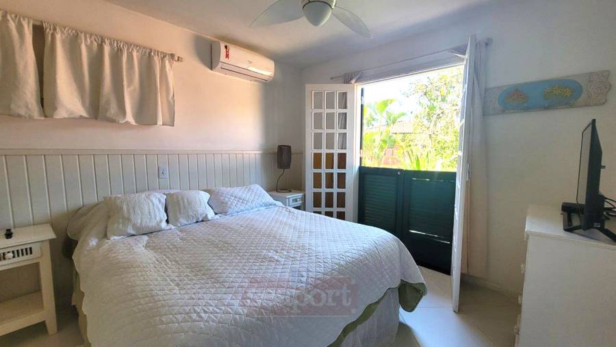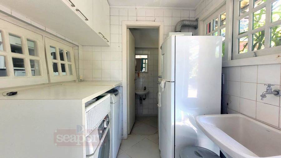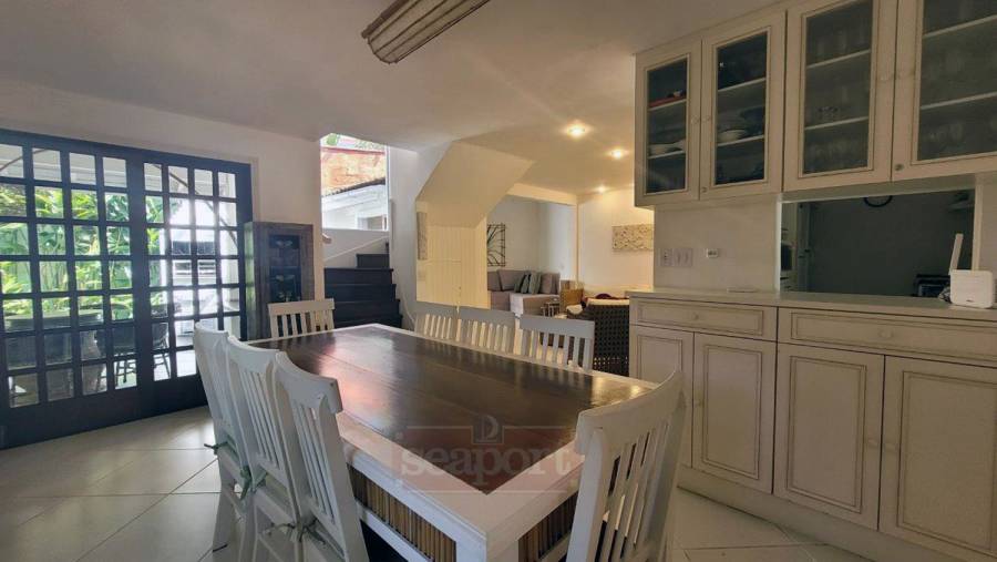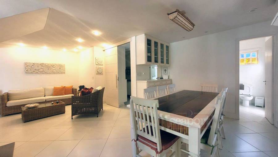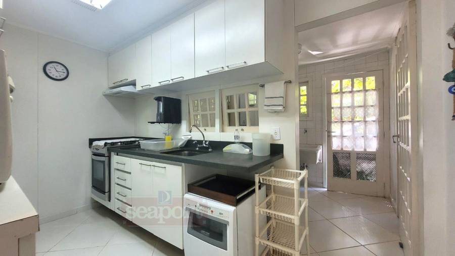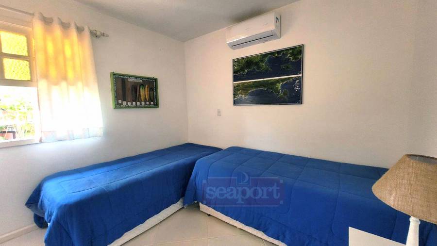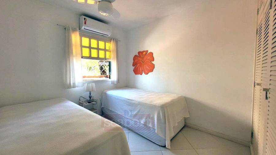 Residência em condomínio frente ao mar com ~160m² de área construída. Possui 3 dormitórios, sendo 1 suíte, e outra suíte americana (banheiro conjulgado) e 1 dormitório, sala de tv e jantar, cozinha americana, dep. de empregada, área de serviço e 3 vagas de garagem, sendo uma coberta.
