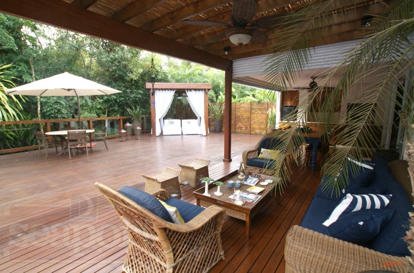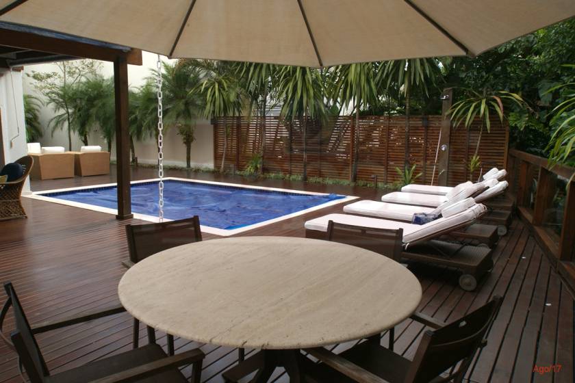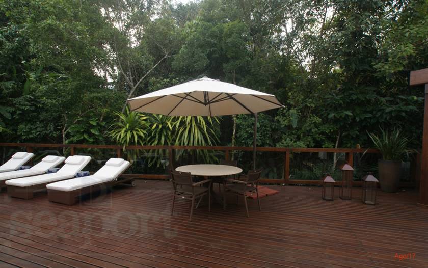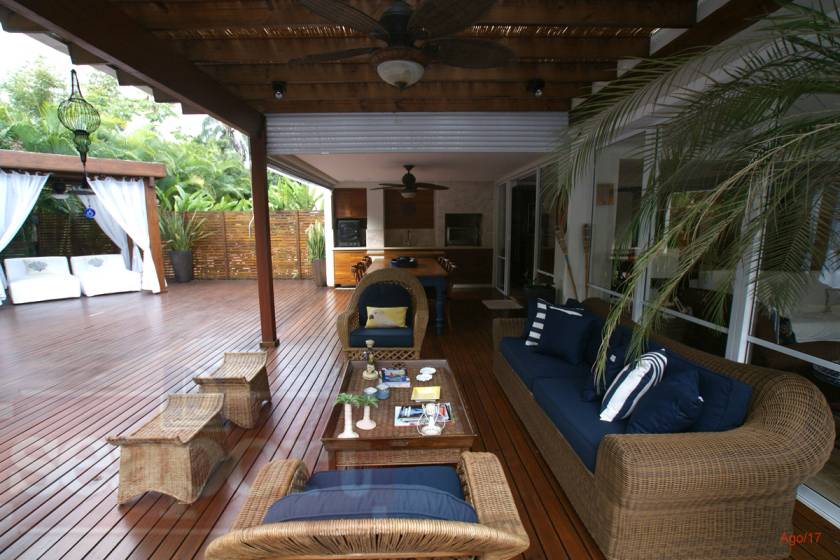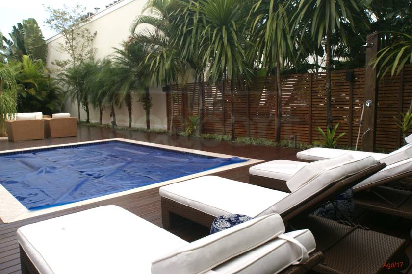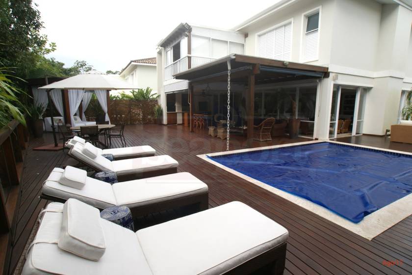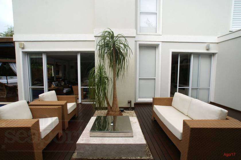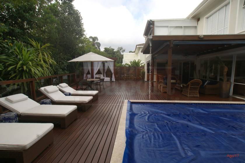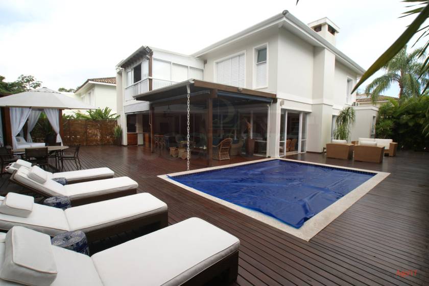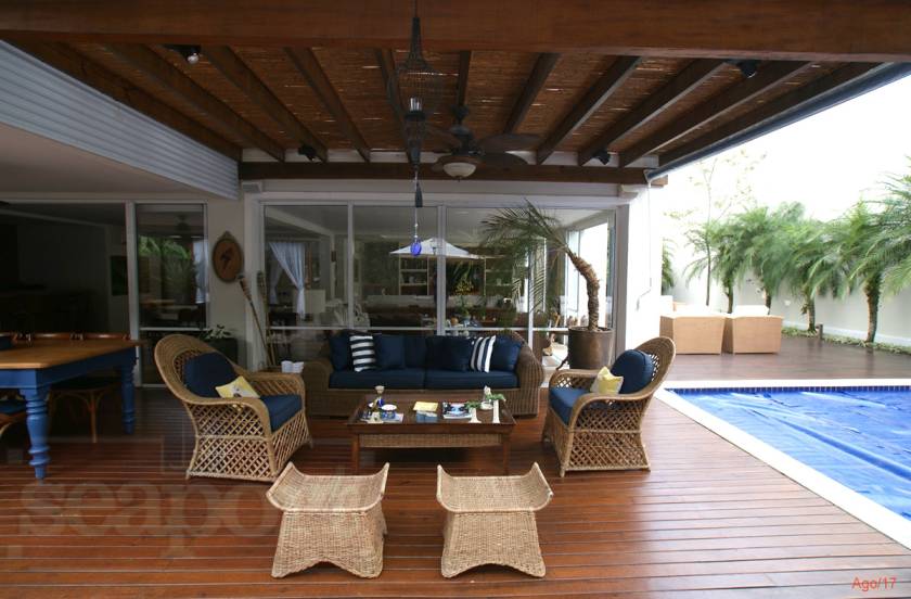 Residência charmosa em condomínio fechado à 150m da praia, com 380m² de área construída, em fração ideal de terreno de 1.128m². Possui 4 suítes, amplas salas de estar, jantar e tv, cozinha, varanda com deck, piscina privativa, espaço gourmet integrado ao deck, bangalo e vaga para 4 autos.