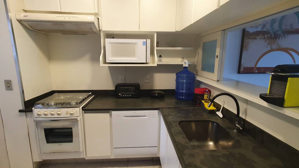 Cozinha com micro-ondas, lava pratos, forninho elétrico, lava pratos.