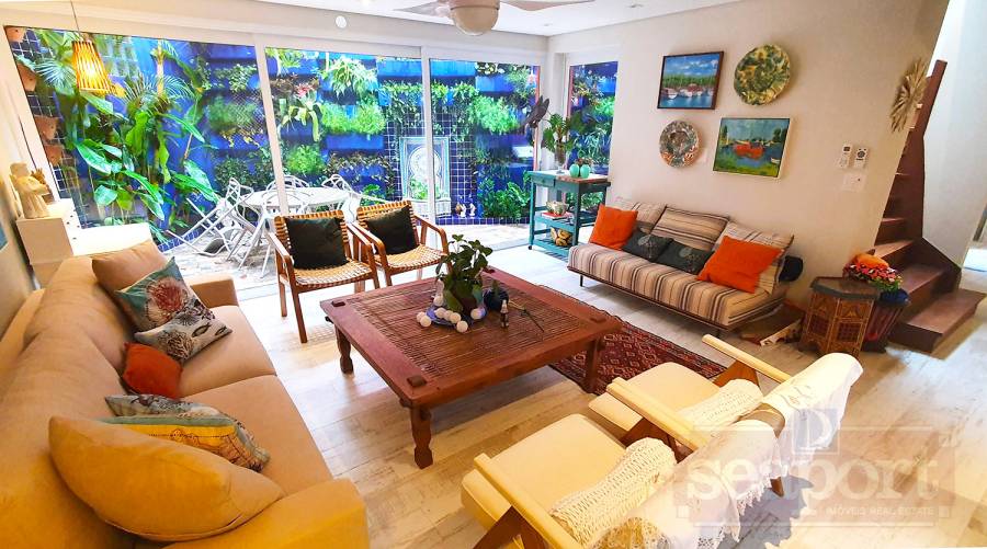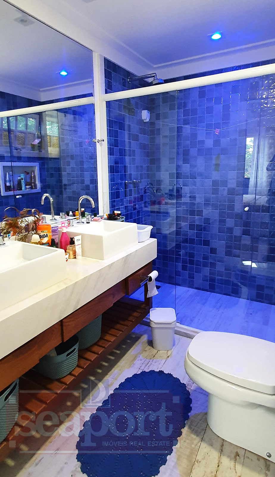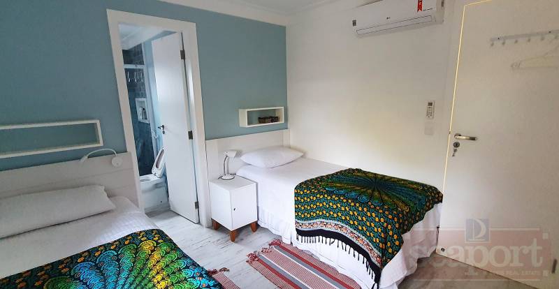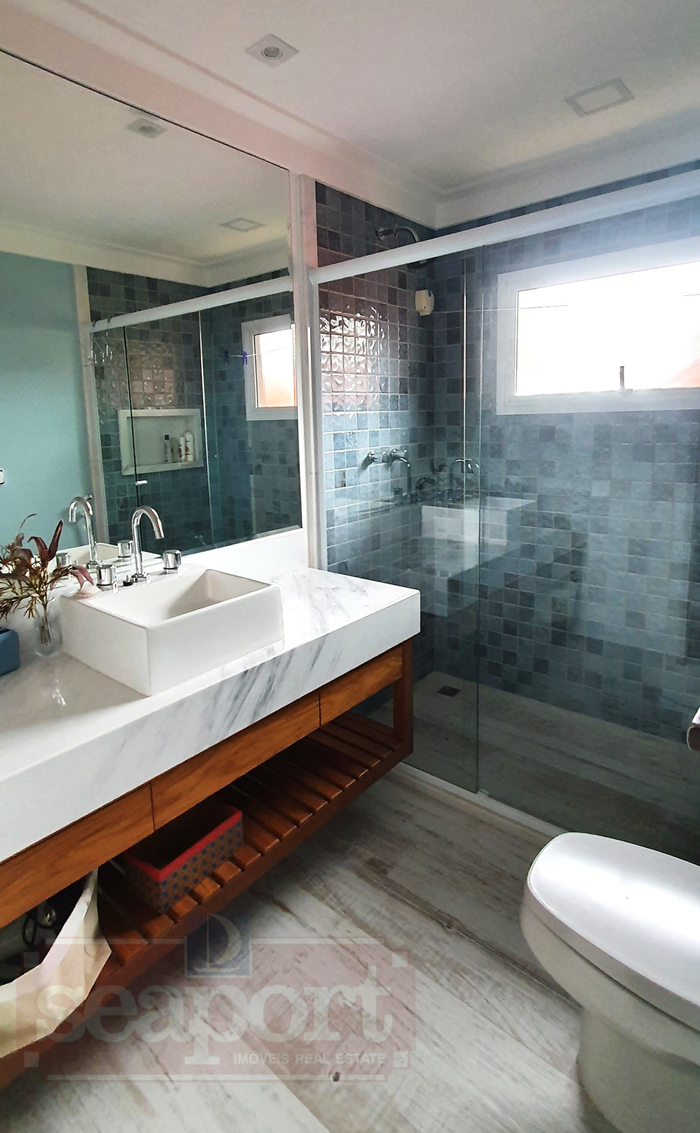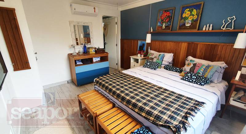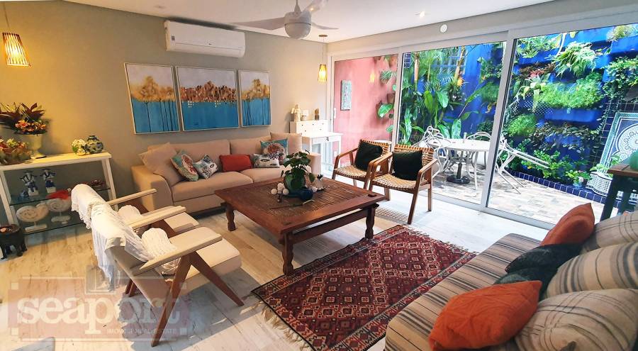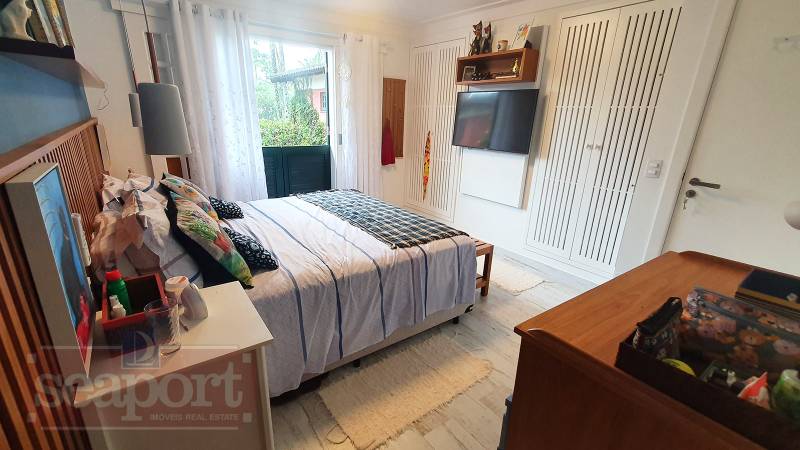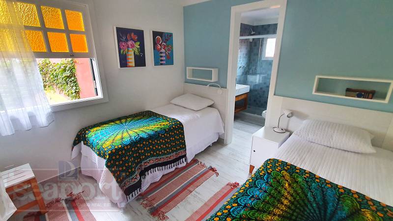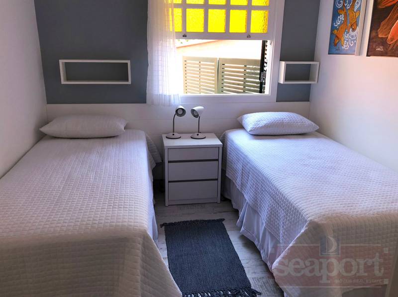 Residência em condomínio frente ao mar com ~160m² de área construída. Possui 4 dormitórios, sendo 3 suítes no 1° andar e 1 dormitório no térreo para criencas ou adolescente, sala de tv e jantar, cozinha americana, área de serviço e 3 vagas, sendo uma coberta.