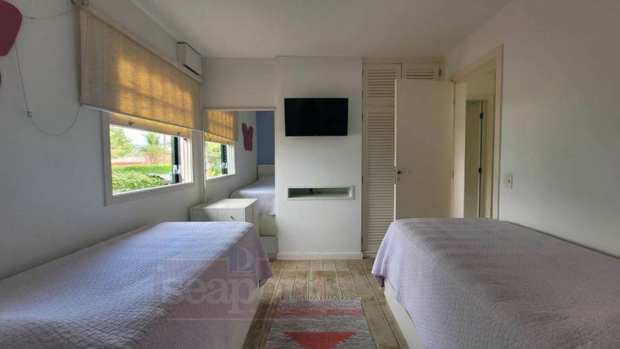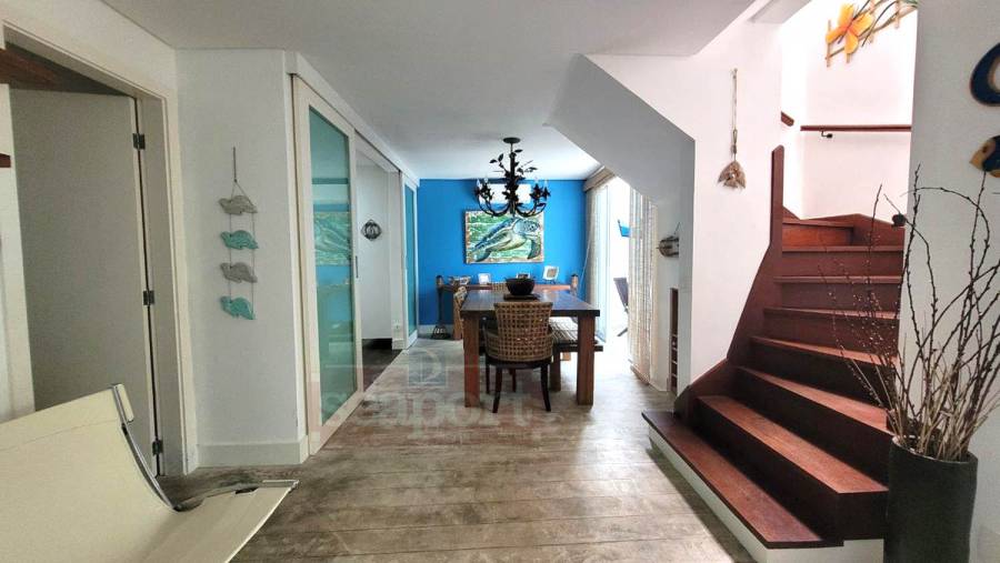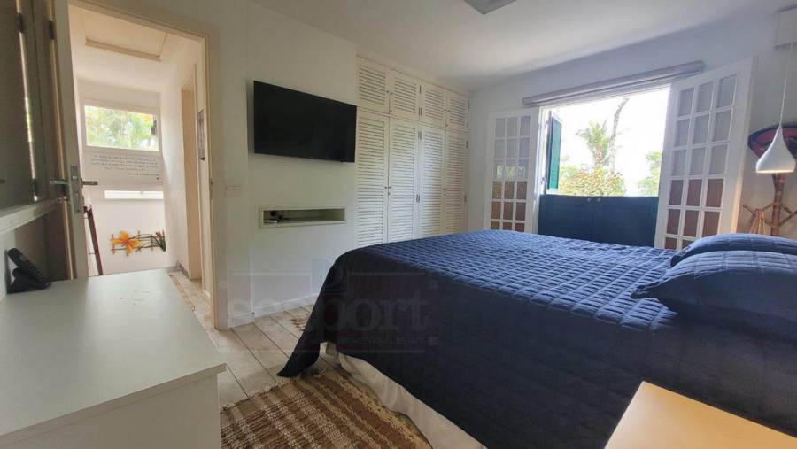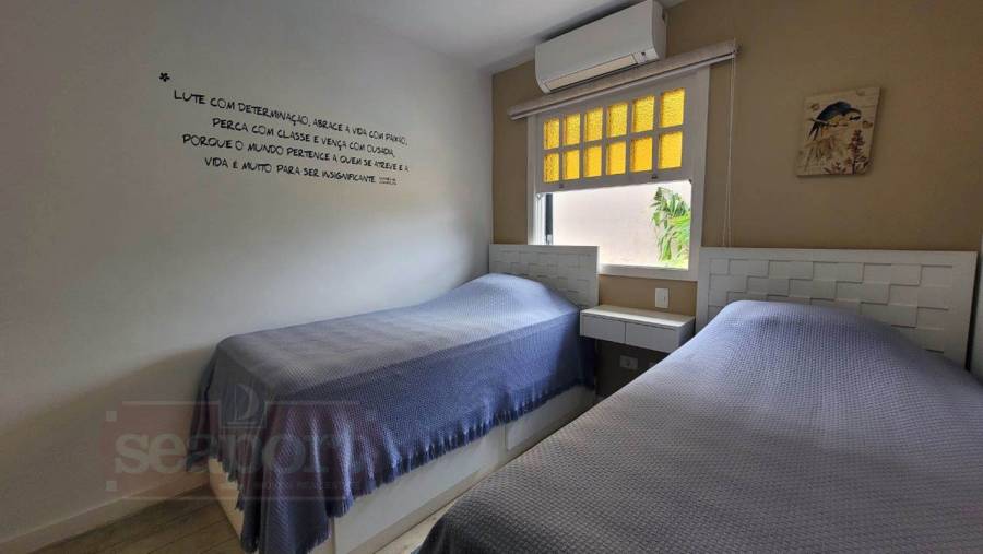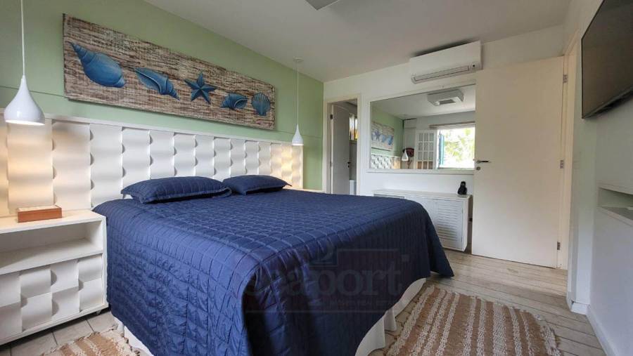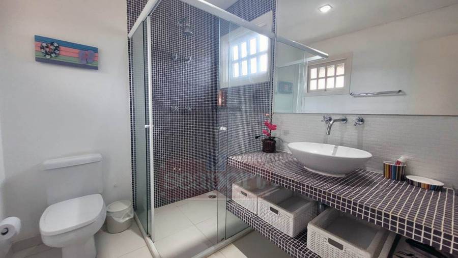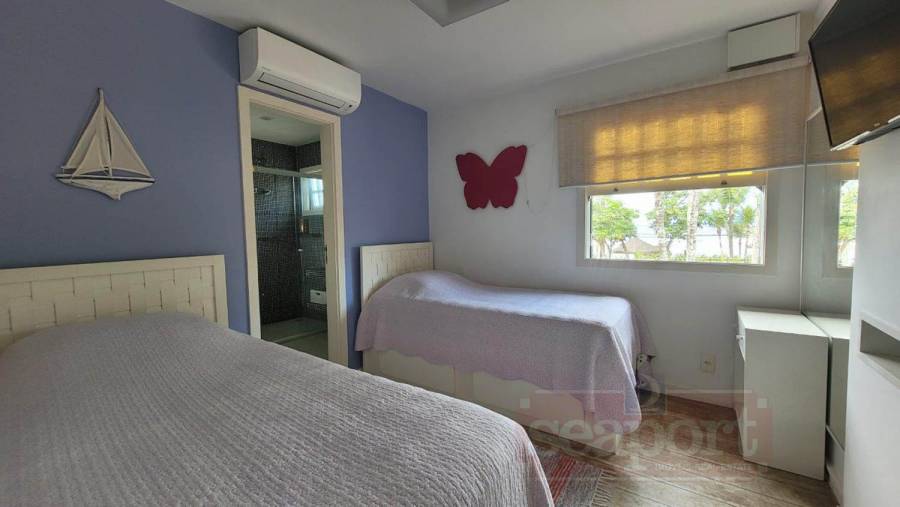 Residência em condomínio frente ao mar com ~170m² de área construída. Possui 4 suítes, sendo uma no andar térreo, sala de estar, jantar e tv, cozinha, varanda, espaço gourmet, e vaga para 3 autos.