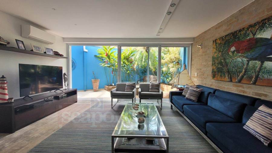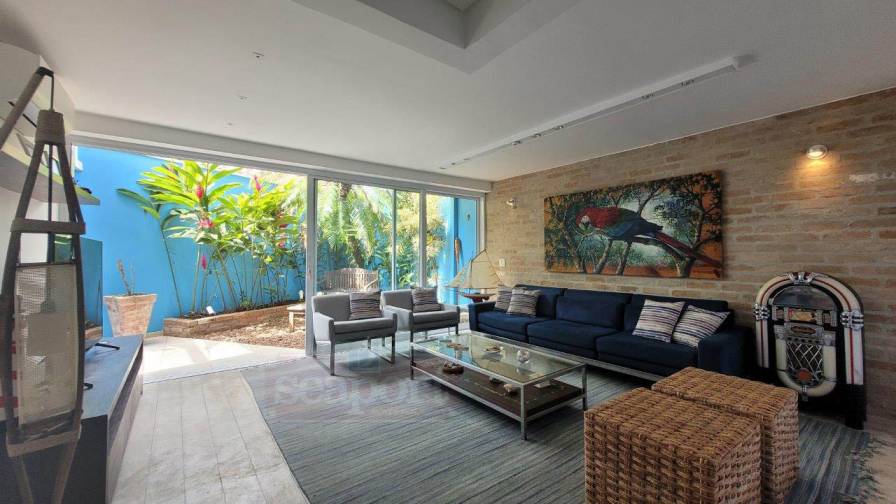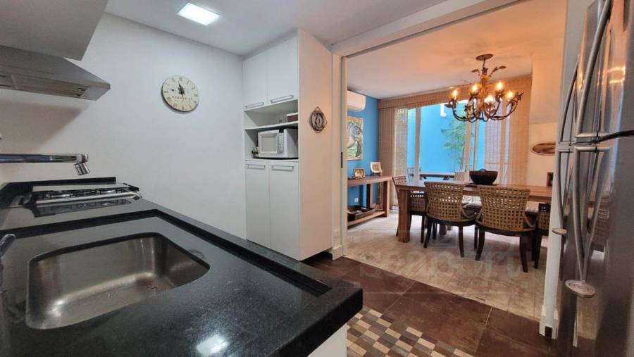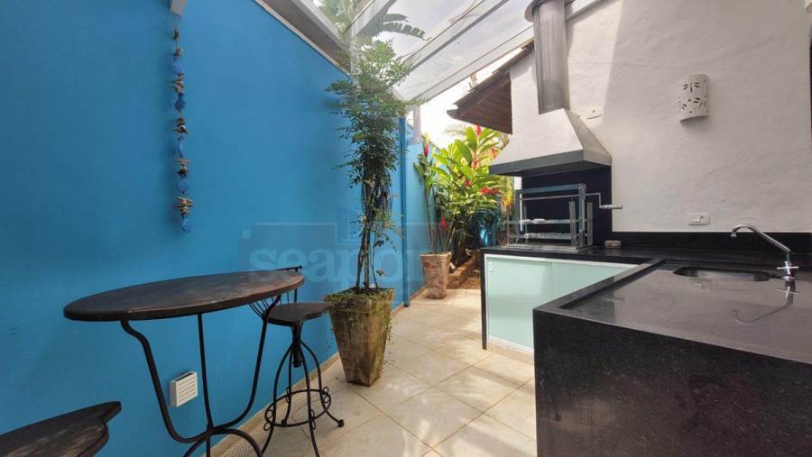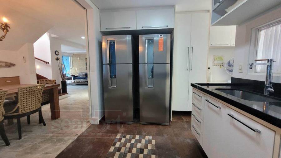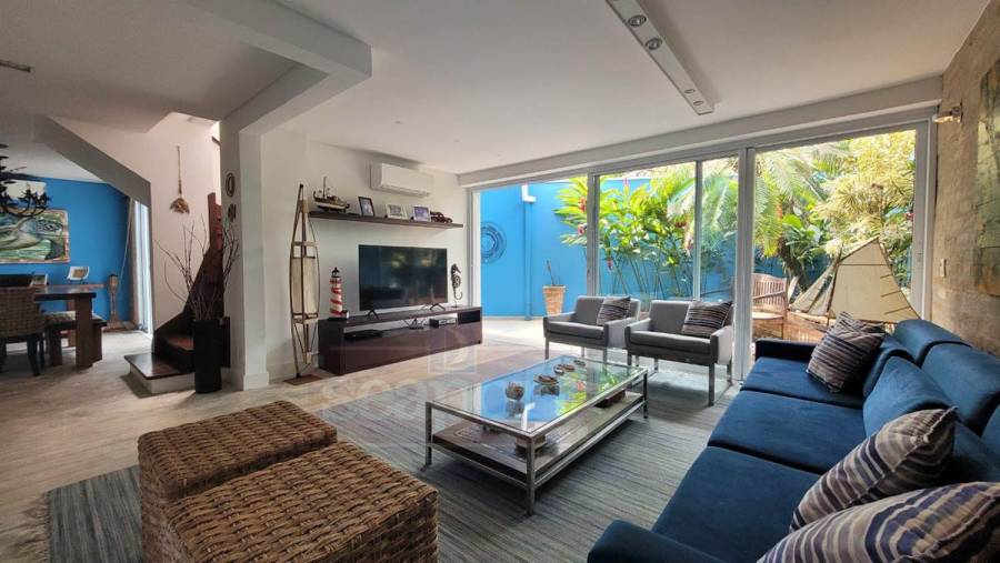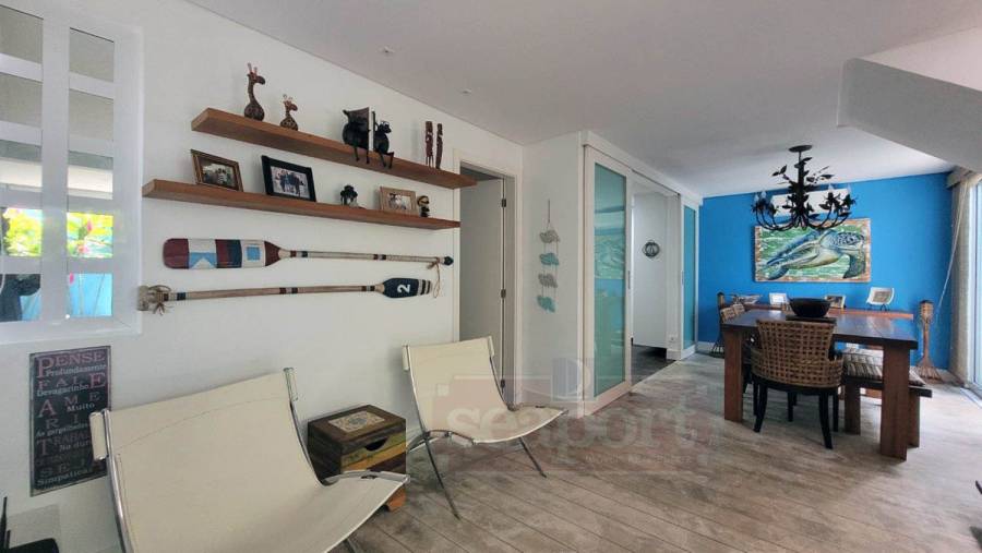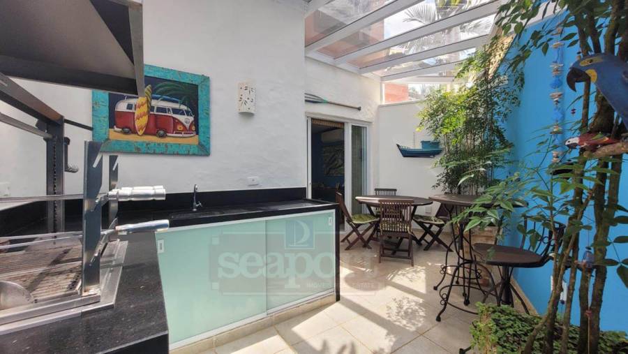 Residência em condomínio frente ao mar com ~170m² de área construída. Possui 4 suítes, sendo uma no andar térreo, sala de estar, jantar e tv, cozinha, varanda, espaço gourmet, e vaga para 3 autos.