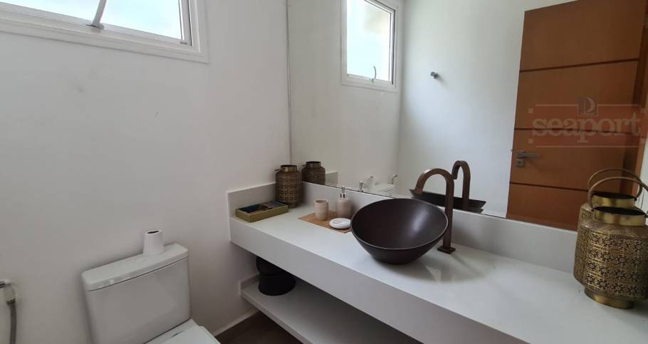 "Residência em condomínio fechado frente ao mar, com 500 m² área construída, em fração de terreno de 500m². Possui 5 suítes, cozinha, sala de estar e jantar, terraço, churrasqueira, piscina privativa e vaga para 5 autos.
