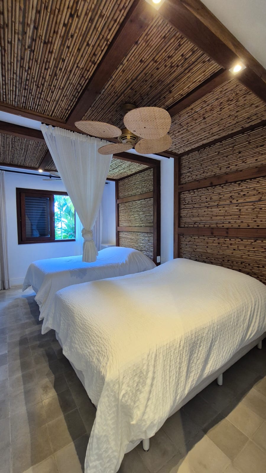 A casa tem 135m2, distribuídos em 3 andares. No primeiro pavimento tem salas, cozinha e salinha em desnível com rede e sofa integrada a sala, cozinha, lavabo, terraço com vista para o jardim e a piscina alem de um deck de madeira em desnível com ganchos para a rede. Na cozinha tem fogão a gas, forno , geladeira com freezer, maquina de cafe e liquidificador. No ambiente todo tem dois ar condicionados e sobre a mesa de jantar um ventilador de teto, alem de uma TV. No segundo pavimento, tem duas suites , sendo uma com cama king size e terraço com vista para o jardim, piscina, mata atlântica e o mar. A outra suite tem duas camas de casal padrão, vista para jardim, piscina e o mar. Ambos quartos possuem ar-condicionados e ventiladores de teto. No terceiro pavimento tem outra suite com sofá cama, (tem pillow-top para colocar em cima do sofa’ cama), ar condicionado e ventilador de teto e um terraço com linda vista para o mar, mata atlântica , jardim e piscina- Acomodação limite, para 6 (seis) pessoas. Não é pertido trazer animais de estimação de qualquer espécie. A casa possui internet wi -fi.
