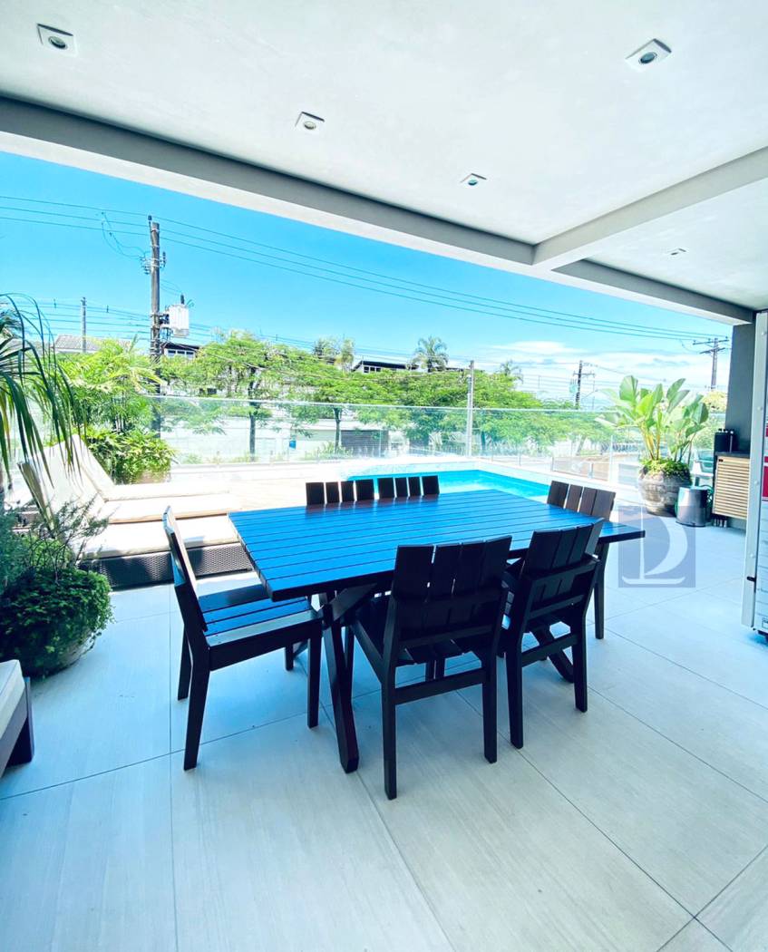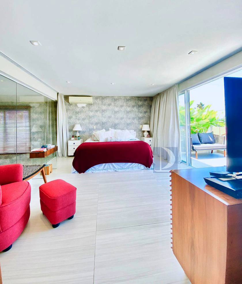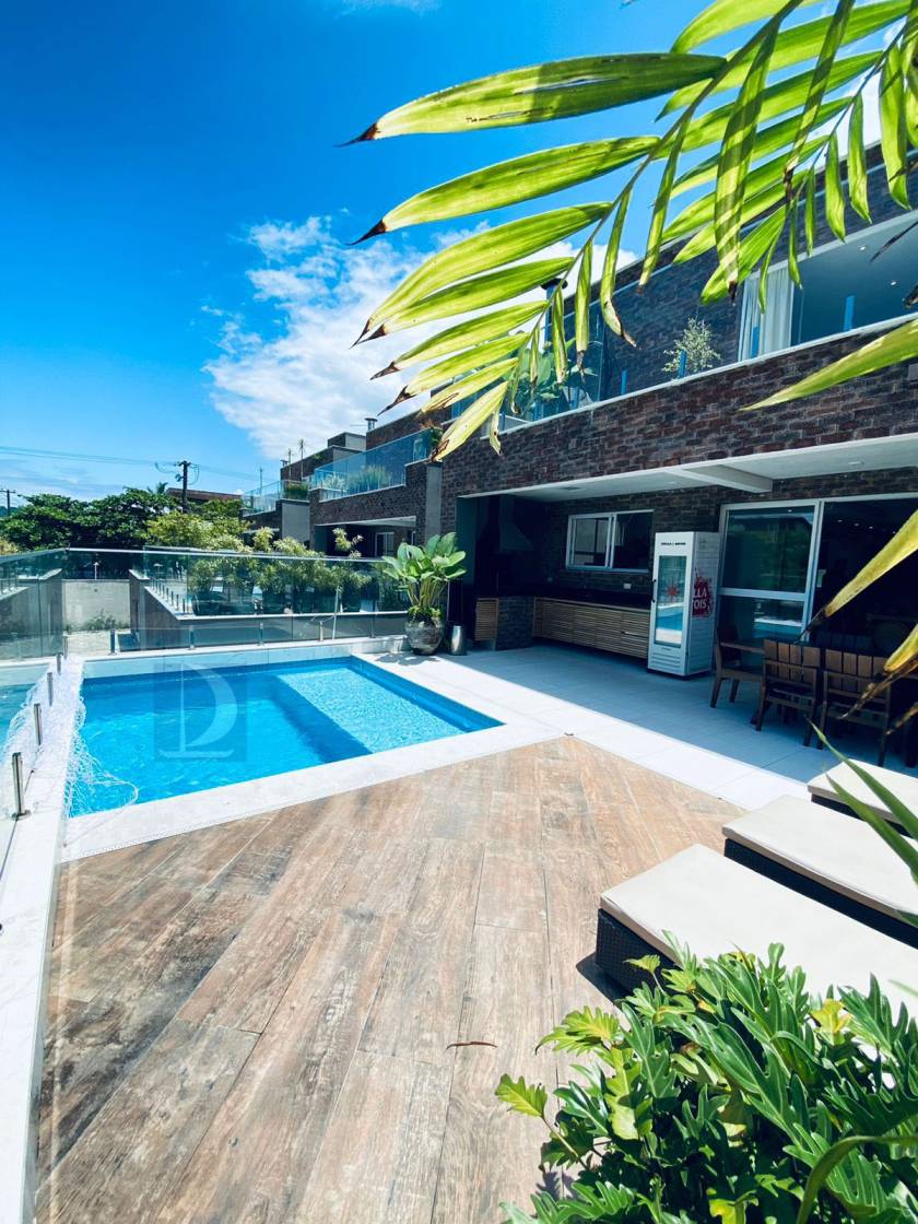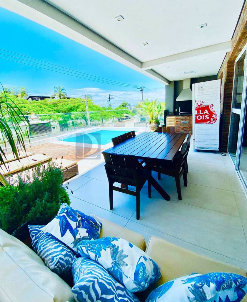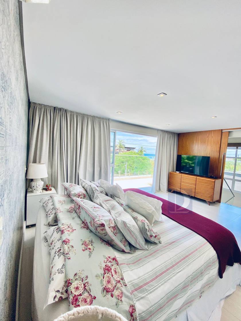 Residência em condomínio fechado à 40m da praia com 300m² de área construída em fração de terreno de 845m². Possui 5 suítes, salas de estar e de jantar, cozinha americana, varanda com piscina e espaço gourmet, area de serviço, wc de emp.e vaga p/ 3 autos
