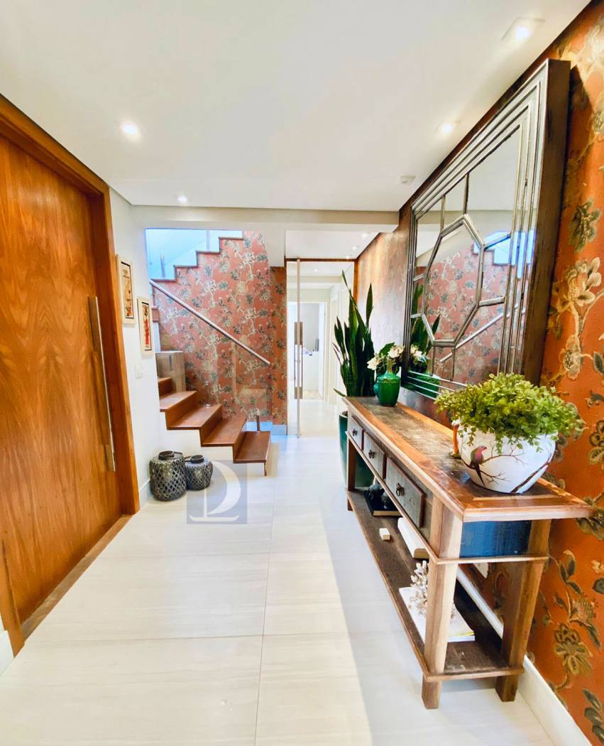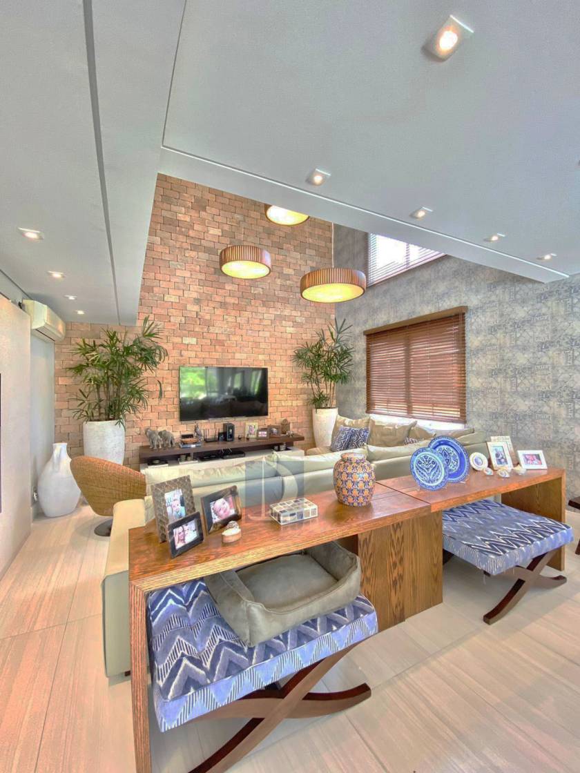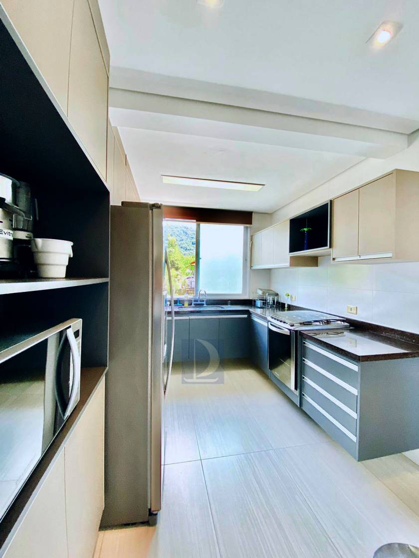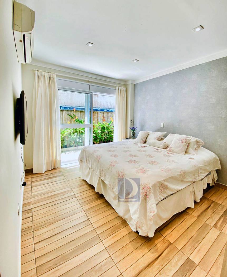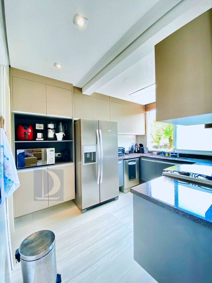 Residência em condomínio fechado à 40m da praia com 300m² de área construída em fração de terreno de 845m². Possui 5 suítes, salas de estar e de jantar, cozinha americana, varanda com piscina e espaço gourmet, area de serviço, wc de emp.e vaga p/ 3 autos